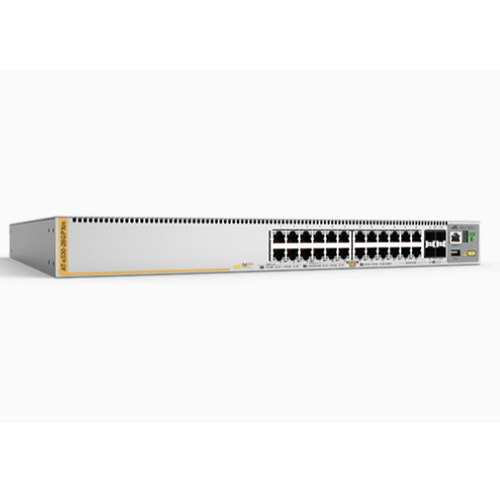 The x530-28GPXm stackable Multi-Gigabit layer 3 switch is high-performing and feature-rich, with 20 x 100M/1G and 4 x 100M/1G/2.5G/5G PoE+ ports, and 4 x 10G uplinks.