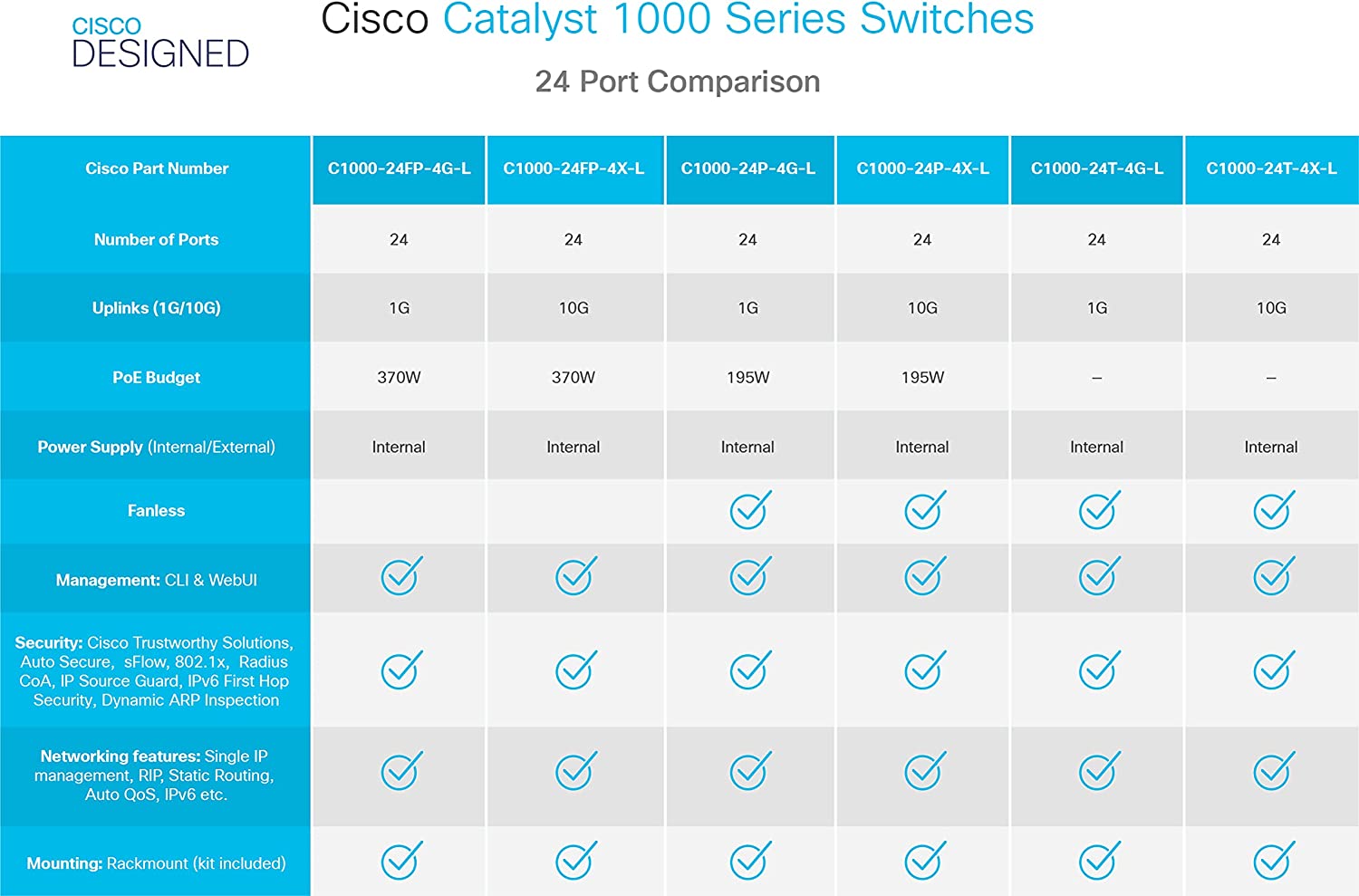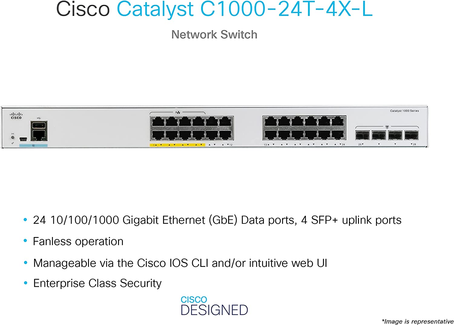The Cisco Catalyst 1000-24T-4X-L Network Switch is an enterprise-class, fixed managed Gigabit Ethernet Layer 2 switch designed for small businesses and branch offices. This simple, flexible, and secure network switch is ideal for critical IoT (Internet of Things) deployments. It operates on Cisco IOS Software and features a CLI (command-line interface) as well as an intuitive web user interface.