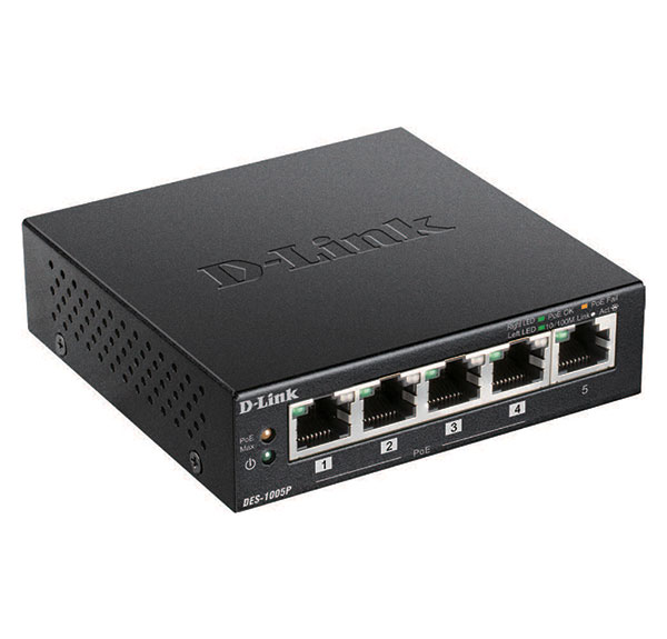 The D-Link DES-1005P 5-Port 10/100 Switch with 4 PoE Ports enables you to connect Power over Ethernet (PoE) devices such as wireless access points (APs), IP cameras, and IP phones to the network. Built with home and small business users in mind, the DES-1005P is compact and operates silently, making it ideal for most rooms and offices.