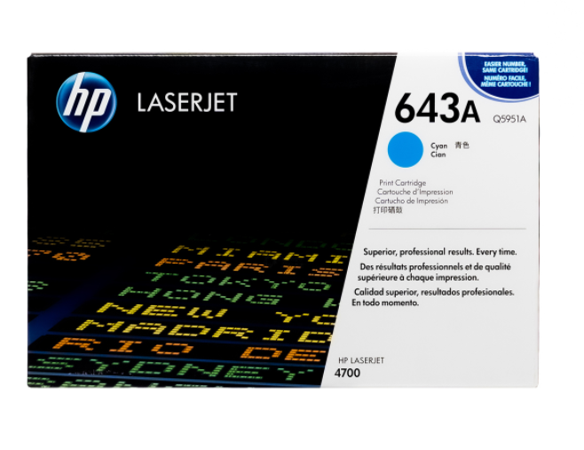 This Original HP 643A Q5951A Cyan Laserjet Toner Cartridge is designed to work with HP Color LaserJet 4700, Color Laserjet 4700dn, Color LaserJet 4700dtn, Color LaserJet 4700n, Color LaserJet 4700ph+ printer models. By using the Original/OEM HP 643A Q5951A Laserjet Toner Cartridge you will always get clear, sharp text and graphics.