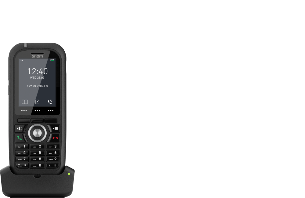The Snom M80 is the perfect all-rounder for indoor as well as outdoor use. The handset is extremely lightweight and compact, and thanks to the special heavy-duty casing (IP 65 and MIL-STD 810g certified) it is particularly robust and durable. This means that the handset can easily withstand drops of up to 2 meters and is also protected against splash water and dust. This makes the Snom M80 not only suitable for the office, but also for rougher locations such as halls, construction sites or outdoor areas.